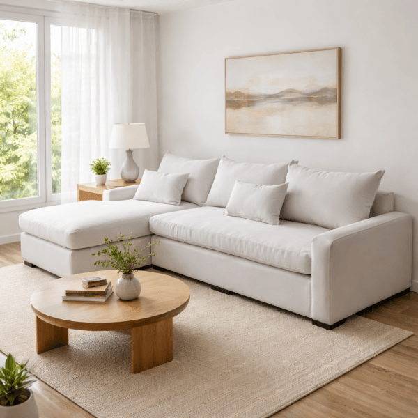 Sofá esquinero de diseño moderno, pensado para maximizar el confort y aprovechar el espacio. Su formato en L ofrece una superficie amplia para relajarse, mientras que su tapizado en tono neutro y líneas limpias aportan elegancia y versatilidad, adaptándose con facilidad a distintos estilos de living.